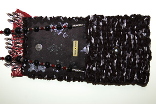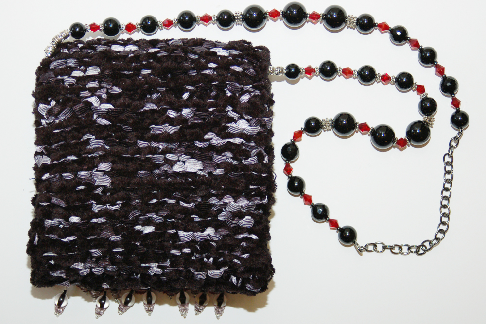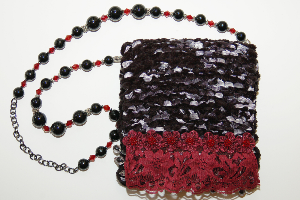 It is constructed of a combination of black chenille yarn and black and silver ribbon yarn. The embellishment on the top flap consists of a row of red lace topped with a row of ruby organza daisies. Blackand translucent bead strands hang from under the lace.