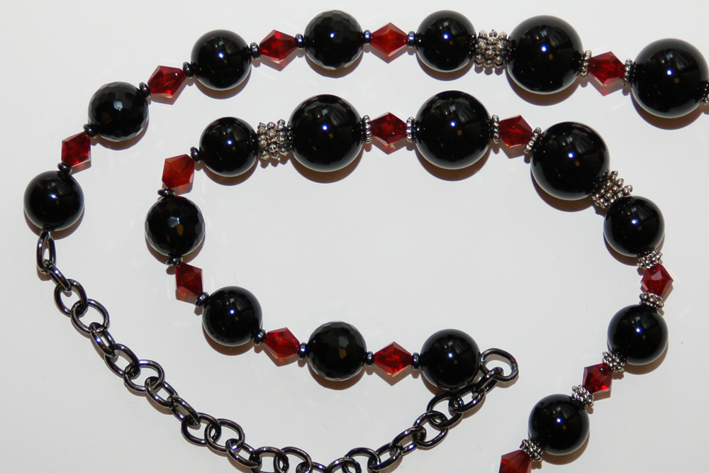 a combination of black and red beads. A medium silver-colored chain allows the purse to rest comfortably on the shoulder. In addition, the strap is
